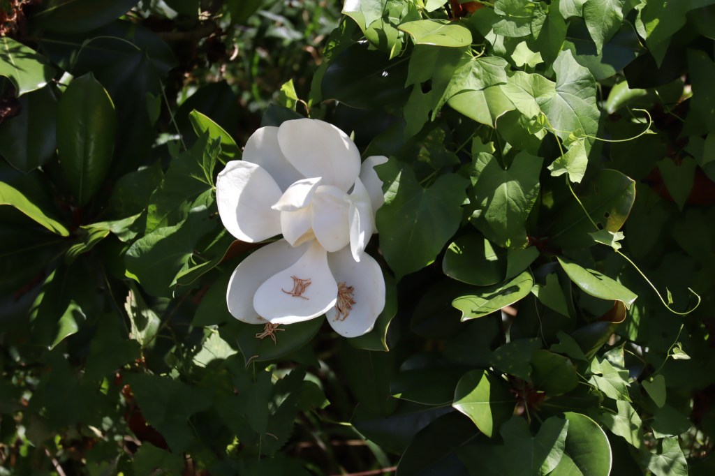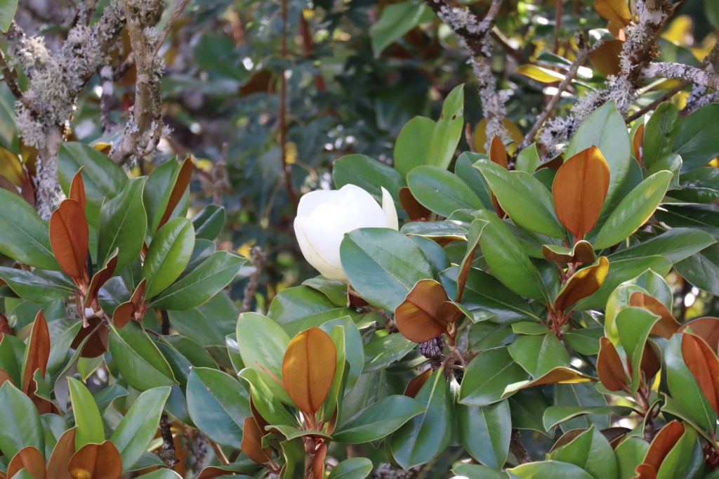 J’ai renoncé à mon projet et je suis sortie -pas en courant mais pas loin- derrière l’église. Alors pas pour faire des bêtises comme dans la chanson mais pour m’asseoir sur un muret, profiter du panorama et de toute cette belle nature autour de moi. Et là j’ai vu en contrebas une magnifique fleur de Magnolia toute blanche, dans un arbre énorme, majestueux…qui va bientôt être en pleine floraison, d’ailleurs il va falloir que j’y retourne en fin de semaine ça devrait être un beau spectacle.