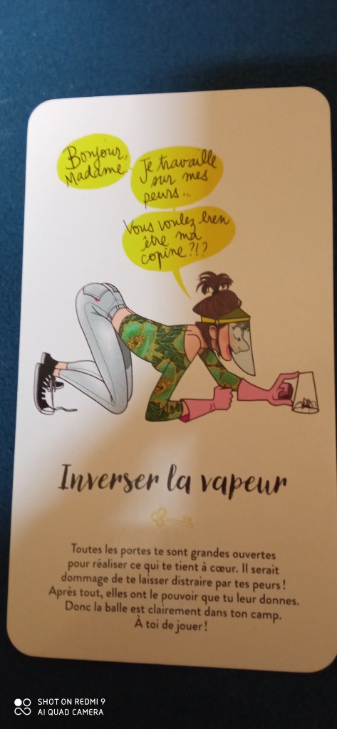 Vous avez vu? Il y a un hippocampe… Ça c’est pour moi…je vois quel « défi » je dois relever, (Je ne vais plus les utiliser ces cartes mes guides se moquent de moi à chaque fois!!😝😝) Je vous explique… à la piscine ils ont installé un nouveau toboggan (oh pas violent… un truc pour les gosses) et j’ai horreur de ça!