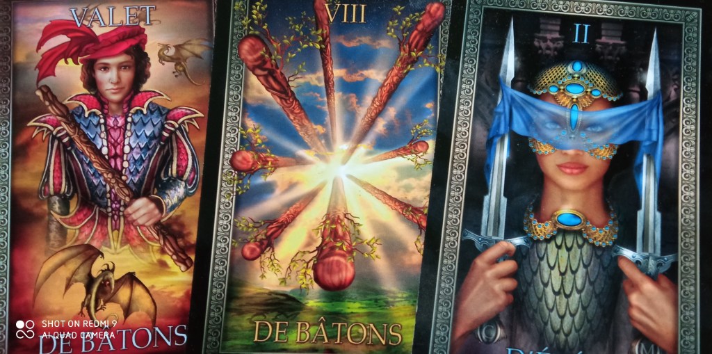 Ensuite le tarot grand luxe nous dit à peu près la même chose. Valet de bâton: bonne nouvelle notamment sur le plan sentimental mais pas que, 8 de bâton: victoire sur les difficultés avec cette belle lumière qui vient faire voler les obstacles en éclats, et le 2 d’épée parle de faire des choix. Alors contrairement à beaucoup de tarots ou le personnage a les yeux bandés et n’y voit rien du tout… là elle triche un peu la p’tite dame…ou alors elle a déjà suffisamment d’informations pour faire ses choix en confiance et en conscience. En tout cas c’est comme si une partie du voile était levé. Elle n’est pas perdue dans le noir et sans repère avec un bandeau opaque sur les yeux… pas du tout, elle voit à travers le tissus et nous pouvons voir ses yeux. Elle sait où elle va, elle a apprit ou comprit quelque chose qui lui apporte une aide précieuse pour prendre une décision. Révélations en vue les amis.