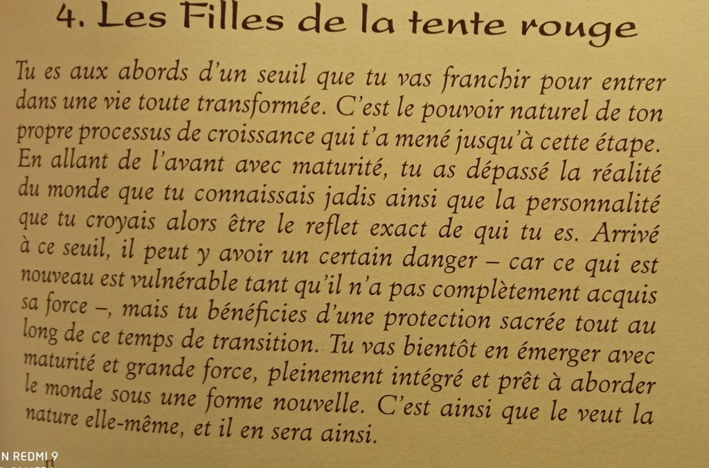 Le voile rouge nous parle de protection, de nous protéger nous-mêmes comme nous l’a dit Merlin. Ça me fait penser également au tissu d’un magicien. On cache une balle dessous et il en ressort une fleur ou une colombe. C’est vous dire si le changement risque d’être radical. Le conseil ici est d’être doux et patient avec nous-même, de garder confiance en soi et en la vie. Éviter les jugements de soi et des autres… c’est juste un passage dont tout le monde sortira grandit. Vous pouvez vous isoler dans votre petite bulle intérieure pour vous ressourcer ou pour vous protéger. Dans la tourmente, nous avons besoin d’une base de repli sûre et sécurisante, que ce soit sur le plan physique ou psychologique, parce que quand un changement est inéluctable, cela ne sert à rien de lutter contre. Il n’y a plus qu’à accueillir ce qui vient.