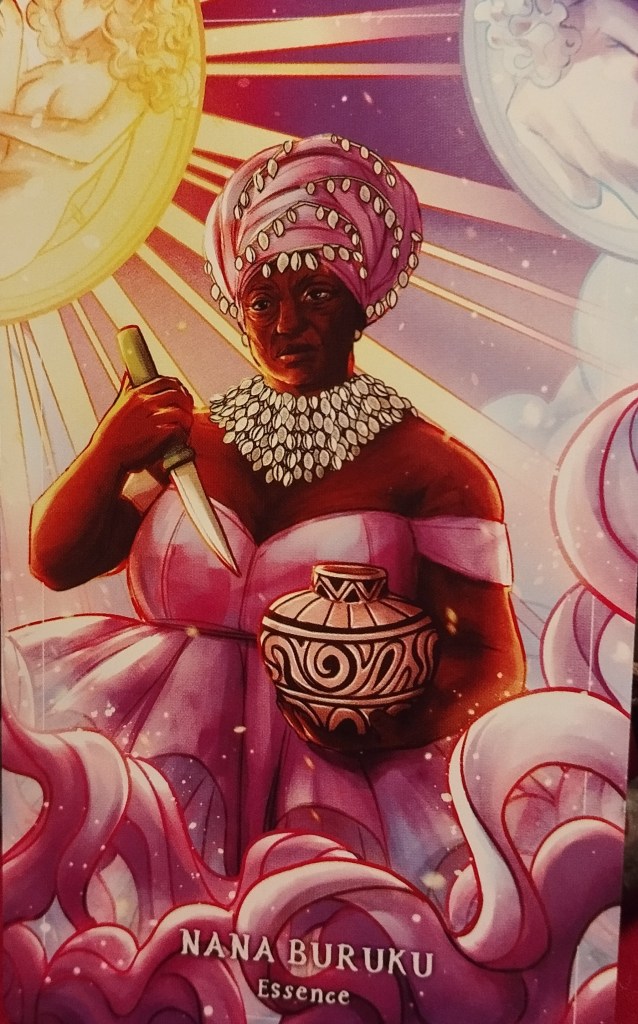Réapparaît là curieusement le personnage de la grand-mère avec la carte « Nana Buruku » du « Metaphysical cannabis oracle ». Grand mère qui porte un couteau rituel, sacrificiel, et un pot mystérieux. Cette grand-mère détient la connaissance, les savoirs ancestraux et la sagesse. Elle est là pour apporter la lumière, la guérison et la consolation malgré son côté un peu effrayant au premier abord. Mais elle peut aussi être là gardienne de certains secrets qu’elle révélera en temps voulu aux personnes qui en seront dignes à ces yeux. Elle semble détenir des informations dangereuses mais pour qui et pour quoi?