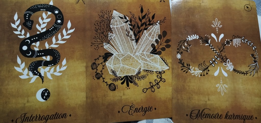 j’ai commencé par « Mon oracle » de Lulumineuse et Margot Motin, puis l’oracle de Noé et l’oracle de Brocéliande pour finir avec mon petit Merlin préféré. Vous savez quoi? Pour une fois j’ai reçu un message relativement doux!! Habituellement quand je demande un peu de réconfort, je me retrouve avec un truc qui n’a rien voir, quand ce ne sont pas carrément des catastrophes. Mais là non…je ne dois pas être là seule à avoir besoin de réconfort!