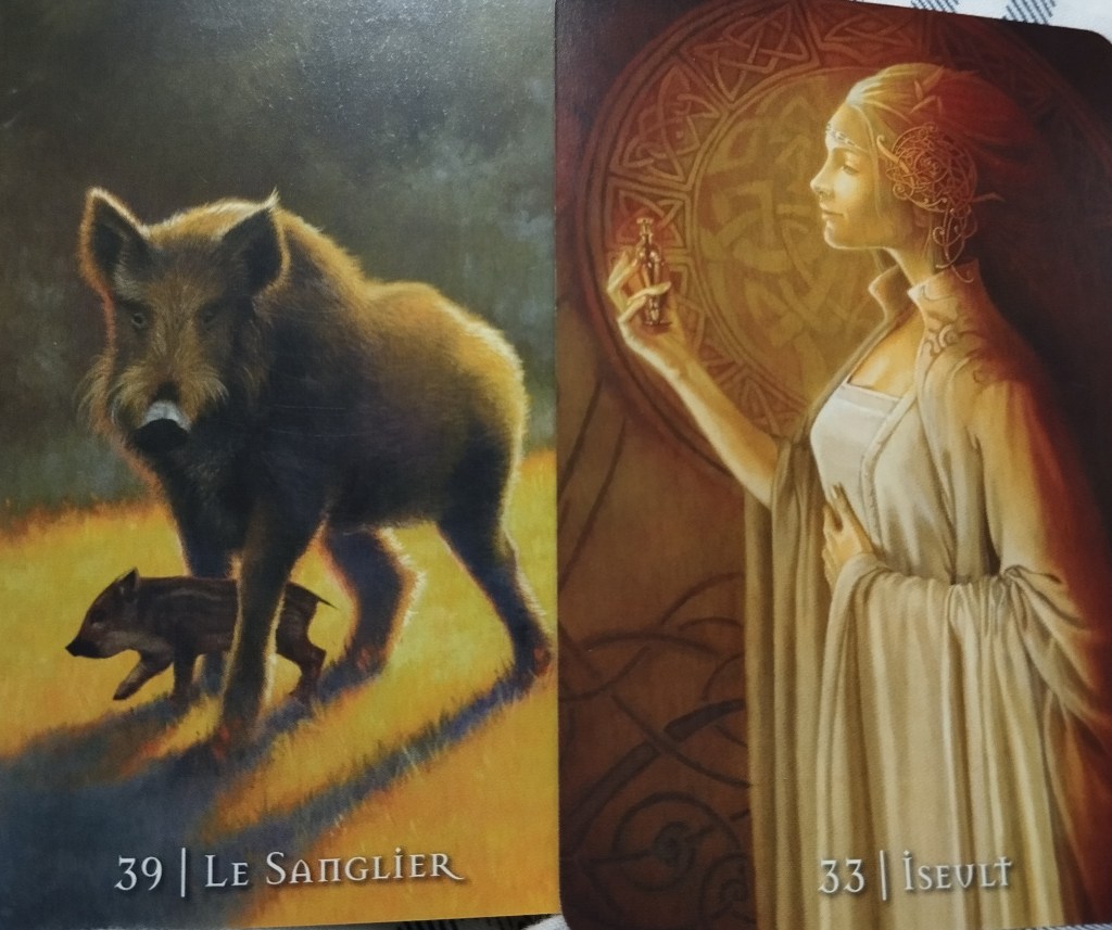 Curieusement, les tons de ces deux cartes sont en harmonie avec les cartes de l’oracle de Noé. Une jolie couleur dorée! Merci pour ce petit bout de soleil! Nous voilà avec un sanglier, synonyme de force vitale, de plaisir et de sexualité, associé à la belle yseult qui nous parle d’amour éternel et inconditionnel. Bon…je ne sais pas à qui tout cela s’adresse mais il y a peut être de belles histoires de couples à venir. En tout cas il est possible que les rôles masculins et féminins commencent à s’équilibrer enfin, même si les histoires de couple sacré, de flammes jumelles et tout et tout c’est pas mon truc! Il peut bousculer un peu les vieux schémas le sanglier, (même s’il semblerait que ce soit plus une laie qu’un sanglier en fait) aider à ce que chacun retrouve sa place et son rôle, avec moins de dépendance affective, moins d’emprise de l’un sur l’autre et sans drama surtout !! A moins que ce ne soit tout l’inverse mais ça je le laisse aux amateurs de mélodrame, moi je préfère une histoire toute simple, tranquille, sans prise de tête…