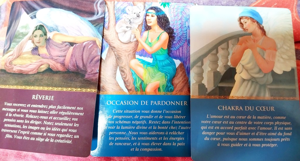 Allez on y va! J’ai pris l’oracle des Elfes, l’oracle de Noé et l’oracle des Anges. Normalement c’est tout doux, tout doux.