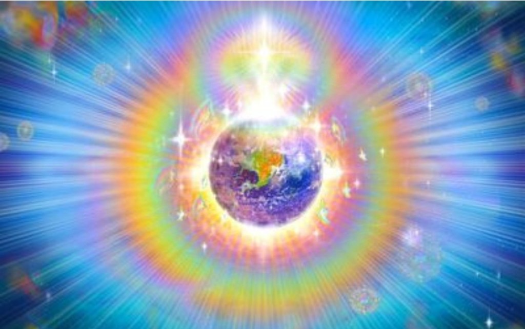 David et moi-même nous sommes en direct du vaisseau Gaialilée pour vous faire vivre cet événement rare. J’espère que nous serons à la hauteur. Nous avons la terre sous les yeux. Je pensais apercevoir nos amis mais tous sont transformés en énergie pure et lumineuse et il n’est pas possible pour moi de les reconnaître. C’est très beau en tout cas, des faisceaux de lumière de différentes couleurs émergent de tout les continents et même de la mer. On dirait un spectacle au laser. Toutes les énergies s’organisent et finissent par constituer comme un halo multicolore tout autour de la terre.