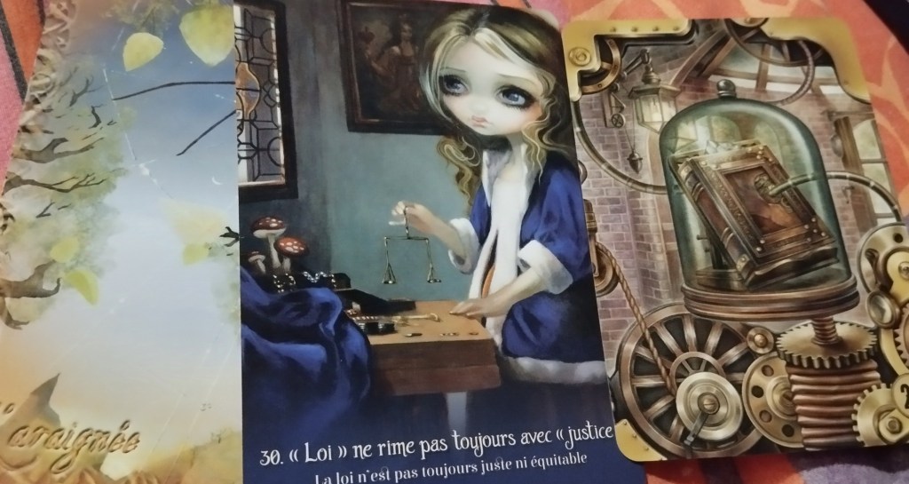 Un grand sentiment de déception et d’injustice s’installe. On a encore nos amanites tue-mouches vous avez vu? Il peut y avoir des jugements rapides et arbitraires, des gens qu’on cherche à faire taire ou à intimider, la dernière carte est un livre sous cloche. On cherche encore à nous cacher des choses…