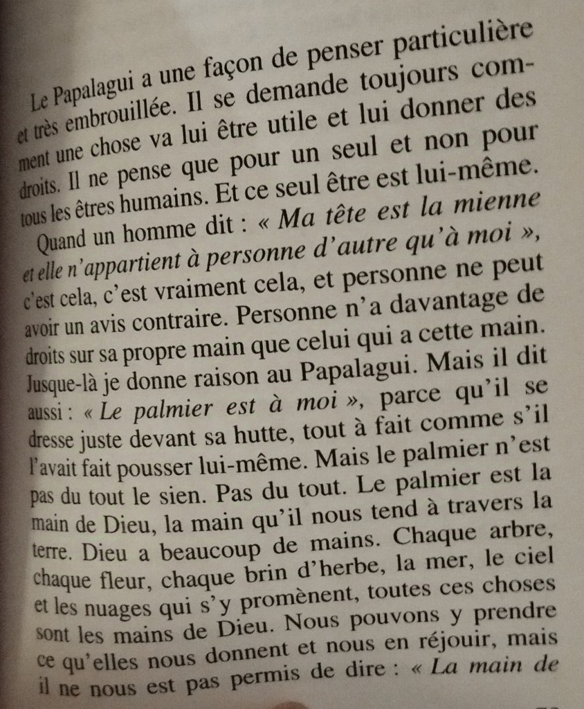 Bon qui veut s’exprimer pour la catastrophe de la semaine? Curieusement j’ai eu envie de prendre le livre le papalagui, les propos d’un chef Samoa au sujet de l’homme blanc. Alors le papalagui c’est nous, ces propos ont été recueillis fin 19ème début 20ème mais sont criant de vérité. Les samoas ne connaissaient pas alors la notion de propriété, (ça a peut être changé depuis…) ils partageaient tout car tout appartenait à Dieu qui mettait l’abondance gracieusement à leur disposition. Ils n’y avait pas de mots pour désigner le tiens/le mien. Tout était à tout le monde.