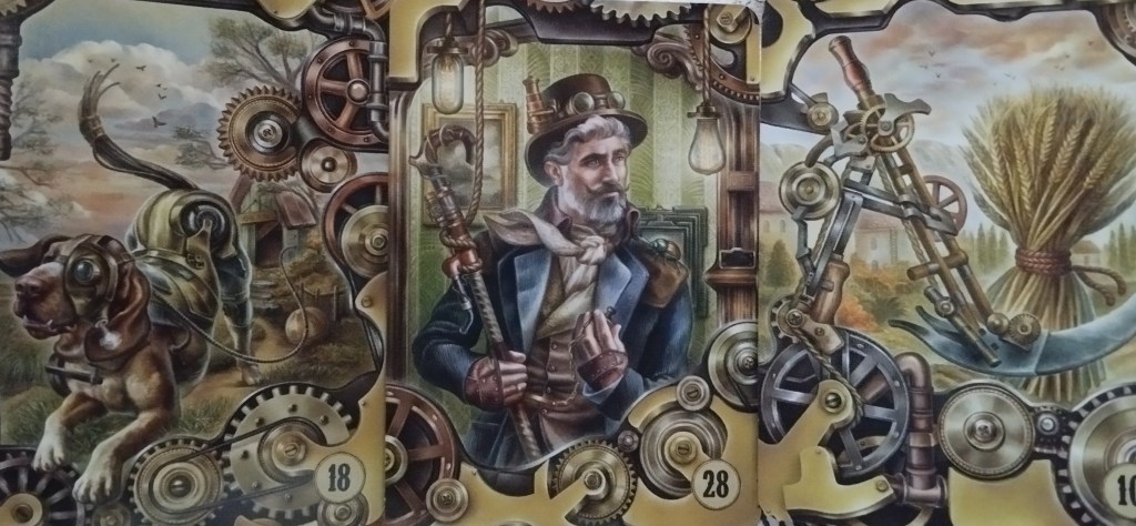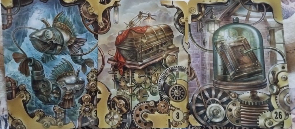 J’ai pris le steampunk Lenormand. Il est pratique pour raconter des histoires. Une carte après l’autre, je pars sur 9 cartes. C’est parti!!!