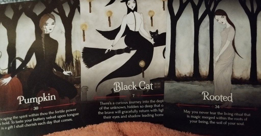 Comme la semaine dernière nous avons encore trois phases. La première symbolise la protection, l’abondance. Nos jolies citrouilles dodues nous nourrissent et nous réchauffent. En cette période de l’année elles nous éclairent et nous protègent des mauvais esprits ou des mauvaises énergies…au choix. Vient ensuite un mouvement, un passage, avec cette sorcière et son chat bien tranquillement installés sur leur balai. Nous finissons sur une carte ou l’abondance semble avoir disparu. Cette sorcière à l’air de vivre beaucoup plus sobrement et simplement que la première. Elle n’est pas démunie pour autant, elle a juste appris à revenir à l’essentiel.