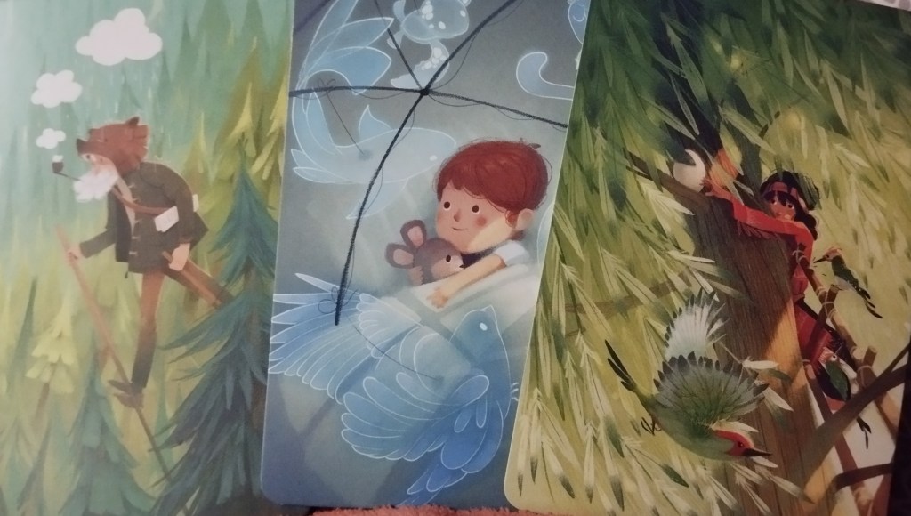 Surprenant ce vert qui contraste fort avec la noirceur des sorcières. Quelque chose semble s’apaiser et en même temps on repart à l’aventure. On va de l’avant, on découvre de nouvelles choses. Il est question d’eau et d’humidité…il est possible que nous en ayons un peu trop dans les jours à venir, soyez prudents. On nous parle encore protection…mais des enfants cette fois. L’enfant est ici bien entouré au milieu d’un couple qui veille sur lui, qui le nourrit physiquement, intellectuellement et affectivement. Il y a des forêts, des arbres. L’homme nous dit de prendre un peu de hauteur afin de retrouver son chemin. La femme apprend à trouver son alimentation dans la nature malgré les difficultés. Chacun doit pouvoir compter sur ses propres ressources parce que les savoirs anciens nous les avons perdus pour la plupart. Tout est à réapprendre mais la confiance semble revenir. J’aime beaucoup ces trois dernières cartes. C’est une très jolie énergie qui en ressort comme pour le steampunk Lenormand la dernière fois.