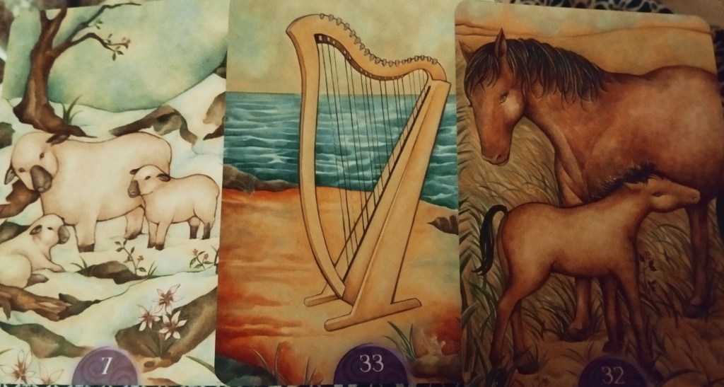 En tout cas la harpe du barde nous annonce la nouvelle, en espérant que le fameux barde ne soit pas Assurancetourix le fameux Gaulois qui finit toujours muselé et ligoté dans un arbre pour le faire taire dans le village d’Astérix! Quoi qu’il en soit cela risque de faire du bruit et de déchaîner des tempêtes médiatiques. La jument et son poulain nous rappellent de rester sur nos gardes et de rester bien centré sur notre troupeau, nos proches, notre groupe d’appartenance quel qu’il soit. Pas forcément dans une attitude de défiance et de surprotection mais plutôt dans la joie, l’amour et la confiance. Tout cela rejoint les très jolies énergies des 2 derniers tirages et mes tirages annuels de novembre et décembre qui étaient plutôt positifs, comme si la fin de l’année s’avérait plus légère que prévu.
